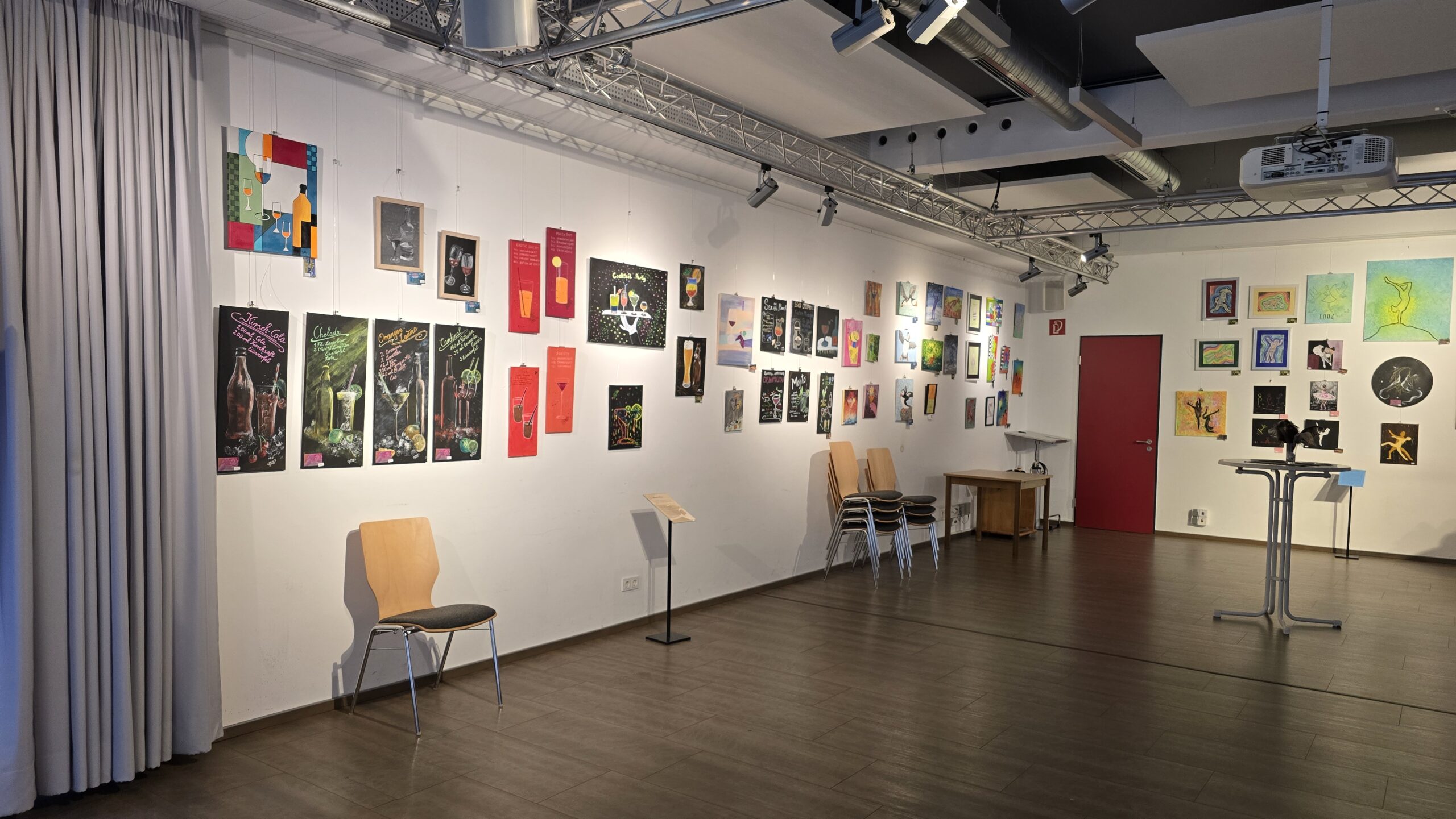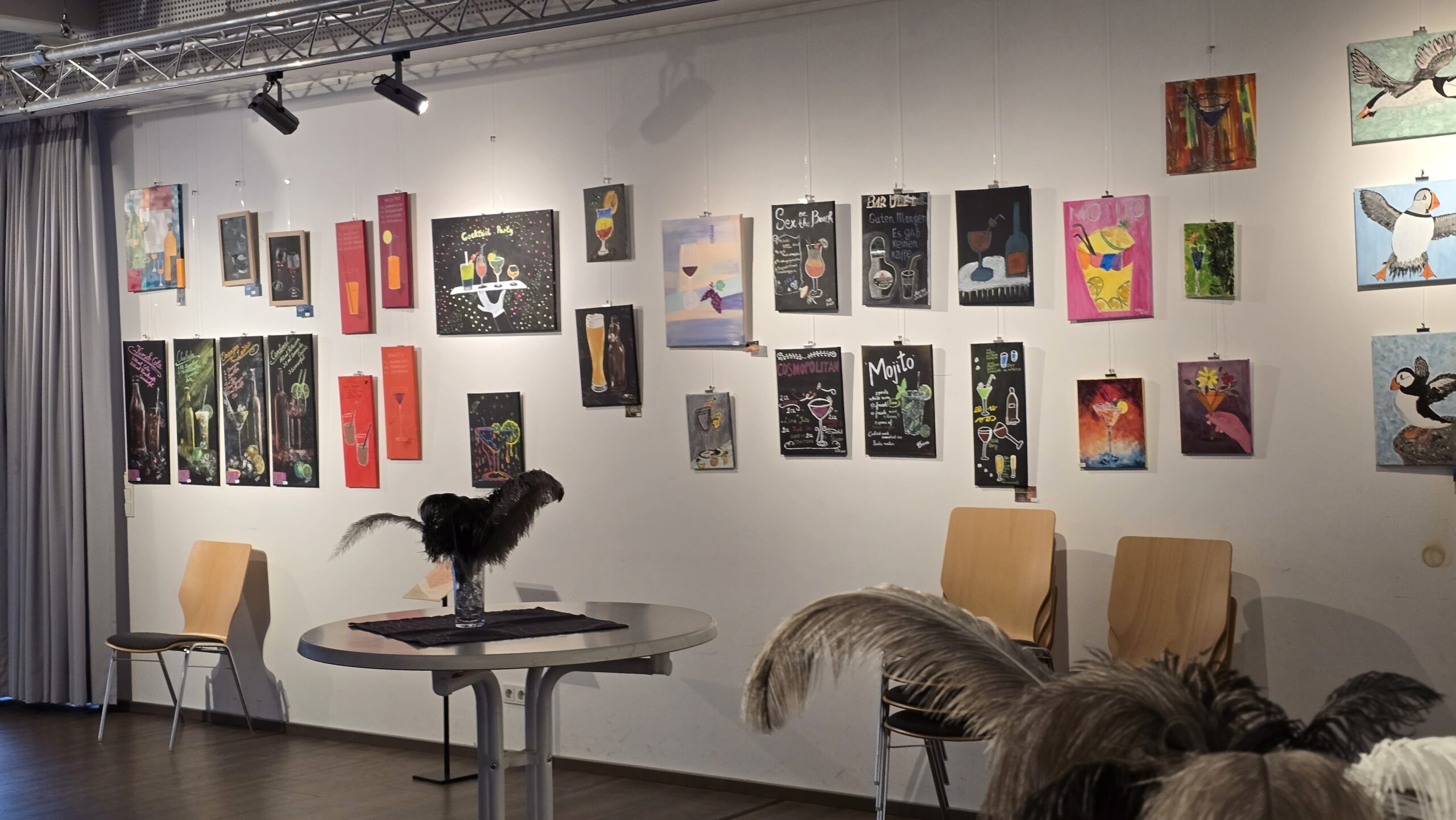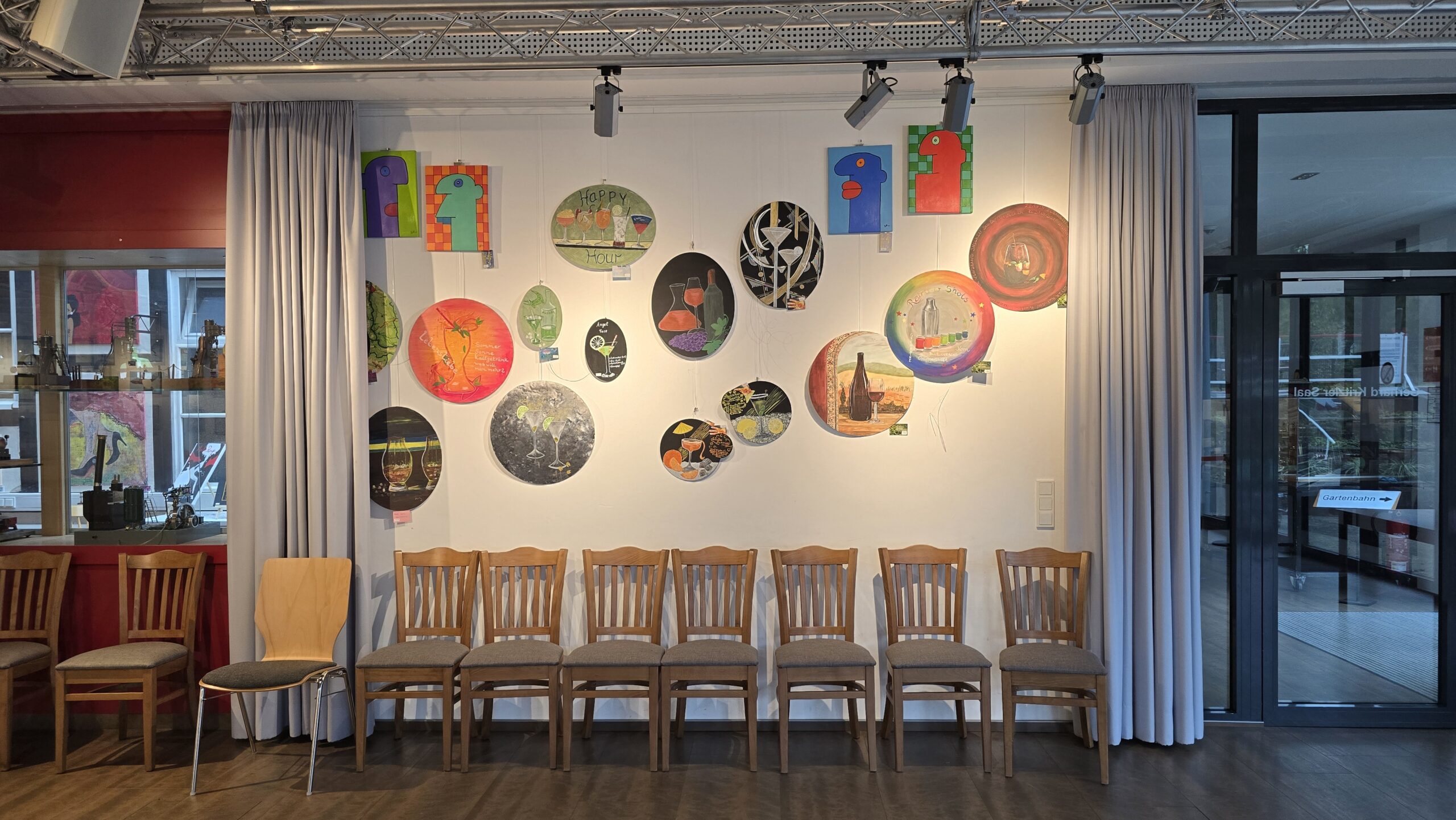 Bereits zum zweiten Mal haben die Künstlerinnen der Malgruppe zu einer feierlichen Ausstellungseröffnung eingeladen. Gezeigt werden Werke zu vier verschiedenen Themen, die in diesem Jahr entstanden sind. Die Gruppe, die sich unter der Leitung von Gudrun Denker regelmäßig im Werkraum des Technikmuseums trifft, hat sich zunächst mit Cocktailbildern befasst: Getränke wie Wein, Bier oder Cocktails, dazu auch Zutaten oder Rezepte, wurden stimmungsvoll in Szene gesetzt. Eine interessante Herausforderung beim Malen war dabei die Darstellung von Gläsern und Flaschen mit ihrer Transparenz und den Lichtreflexen. Auch die Verwendung runder und ovaler Leinwandkartons war für viele eine neue Erfahrung, ebenso die harmonische Verbindung von Bild und Schrift. Die Ergebnisse schmücken nun zwei Wände des großen Saals im Technikmuseum.