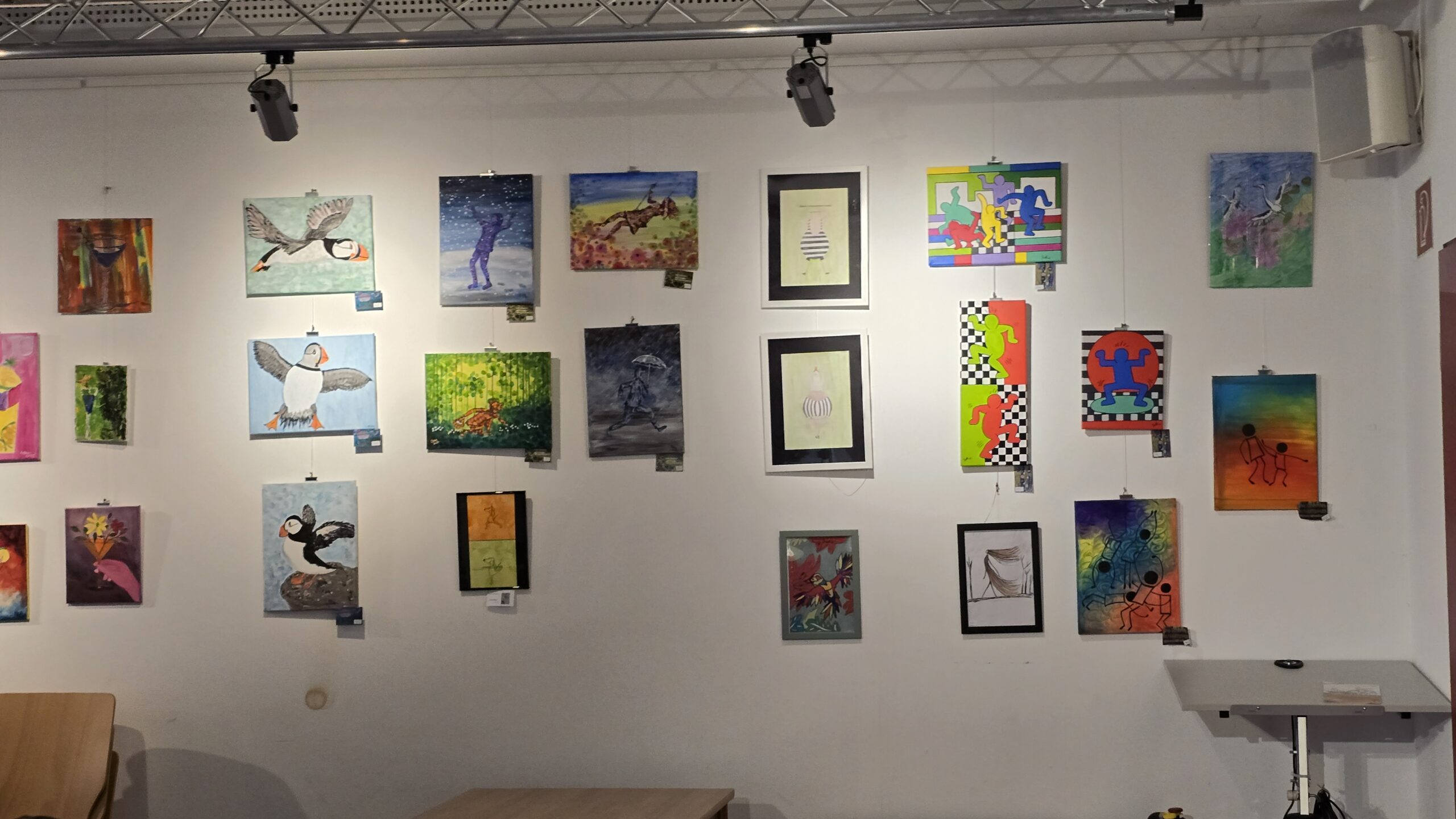 Eine ganze Reihe weiterer Bilder zeigt „Bewegte Körper“. Dazu haben sich die Malerinnen mit den unterschiedlichsten Facetten von Bewegung beschäftigt. Zunächst denkt man dabei an Sportler aller Art, an grazile Bewegungen beim Tanz oder an die kraftvollen Kunststücke der Akrobaten. Aber auch im Alltag, bei der Arbeit, in der Freizeit bewegen sich Menschen auf unterschiedliche Weise. Ebenso sind Tiere auf vielfältige Art in Bewegung, zu Land, zu Wasser und in der Luft. „Die Idee zu diesem Thema kam mir im Wartezimmer meiner Physiotherapeutin“, verrät Gudrun Denker. „Ich konnte mir sehr gut Bilder zu bewegten Körpern an den Wänden dort vorstellen.“ Mit Pinsel und Acrylfarben, mit Stiften oder Pastellkreiden haben die Mitglieder der Malgruppe versucht, die Schönheit, den Schwung und die Leichtigkeit, aber auch die Mühe und das Alltägliche von Bewegung einzufangen. Entstanden ist eine große Bandbreite von Werken verschiedenster Körper „in Aktion“.
